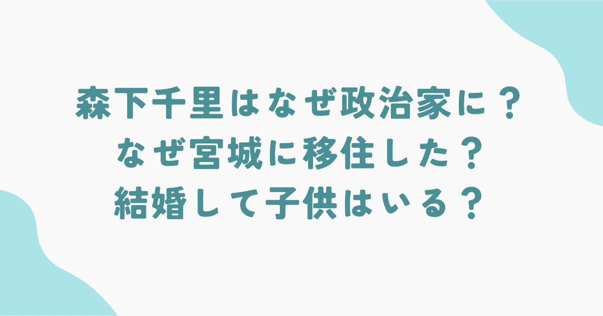 この記事では、森下千里さんの政治家転身の背景・石巻移住の理由・現在の結婚観や生活について詳しく紹介します。